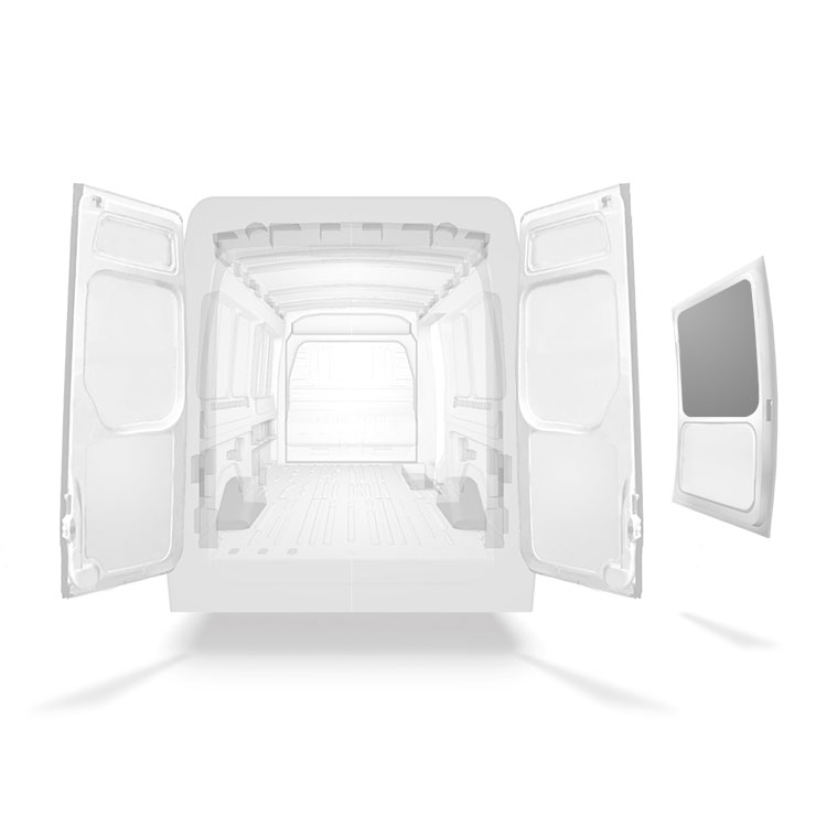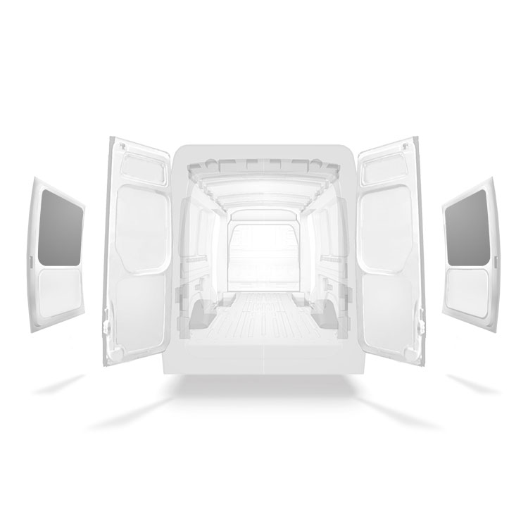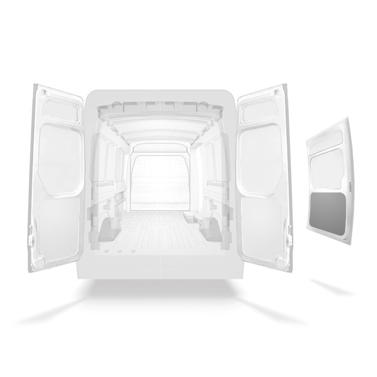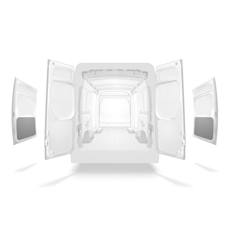 Disponibilizamos uma gama de peças de painéis para portas laterais que se ajusta a diferentes desenhos e configurações de porta, sendo compatíveis com uma ampla gama de veículos comerciais. Devido ao seu carácter leve e ao facto de terem sido desenhados para proporcionarem um acabamento profissional do interior, os painéis para portas estão disponíveis na versão integral, cobrindo a porta na sua totalidade ou em módulos para encaixar entre as barras da porta. É possível colocar de modo não intrusivo os painéis para portas, mediante a utilização de uma cola com grande capacidade adesiva, para uma instalação mais fácil, embora também seja possível executar a instalação recorrendo ao método tradicional dos parafusos.