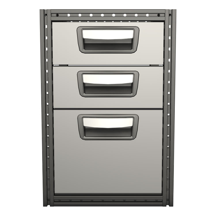 Os módulos de gavetas têm larguras, profundidades e alturas modulares, e são facilmente combináveis com os restantes produtos da gama. Os perfis T-tracks integrados podem ser utilizados para amarrar a carga e fixar acessórios, ou tornar mais versátil a superfície de montagem. Cada uma das gavetas está equipada de série com guias de rolamentos de esferas. As gavetas são totalmente removíveis e têm puxadores integrados. Para ajudar a otimizar o peso, os painéis de acabamento e os painéis para ferramentas são opcionais.