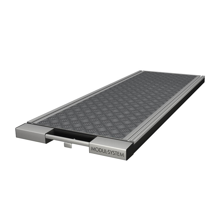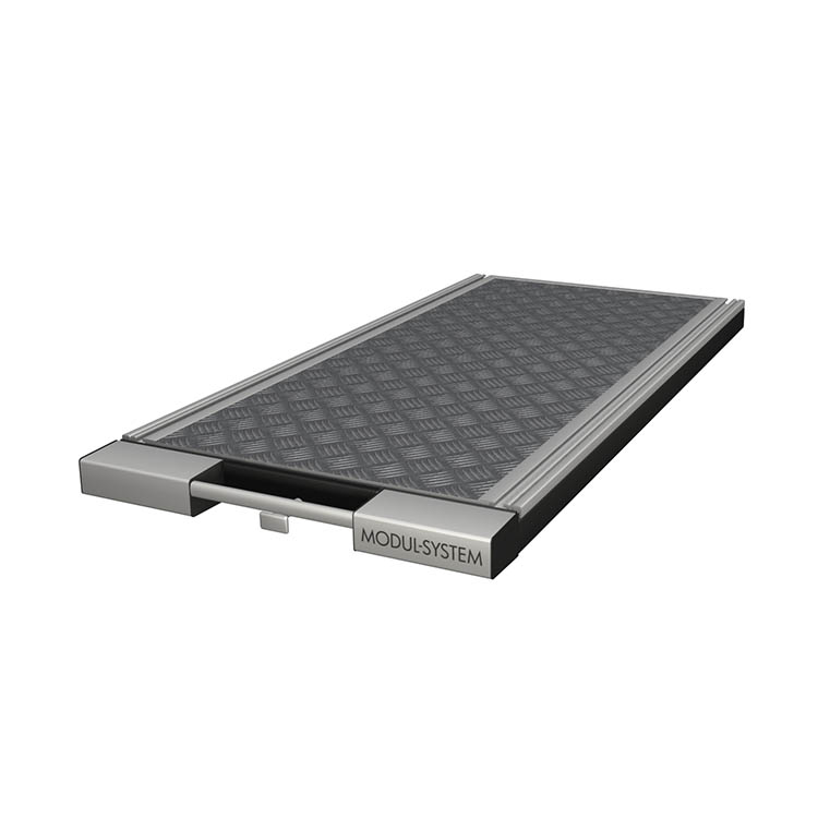As bases extensíveis são fixadas ao piso do veículo e são indicadas para carregar e descarregar produtos pesados e volumosos. Um mecanismo simples de desbloqueio permite extrair facilmente parte da base do veículo. A base é extraível em 70 porcento. As plataformas de carga com arestas metálicas estão disponíveis em três modelos diferentes, todas elas fabricadas por encomenda e incluem um tapete de borracha.