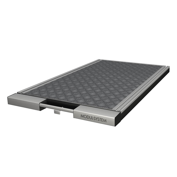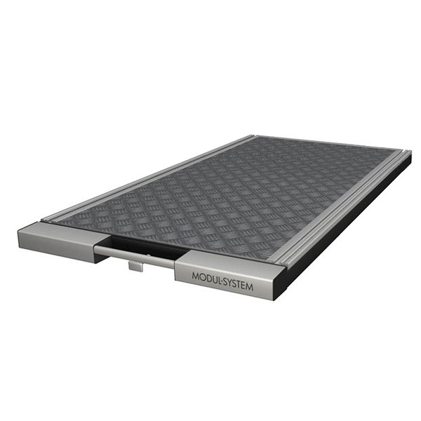 As bases extensíveis são fixadas ao piso do veículo e são indicadas para carregar e descarregar produtos pesados e volumosos. Um mecanismo simples de desbloqueio permite extrair facilmente parte da base do veículo. A base é extraível em 70 porcento. As plataformas de carga com arestas metálicas estão disponíveis em três modelos diferentes, todas elas fabricadas por encomenda e incluem um tapete de borracha.
