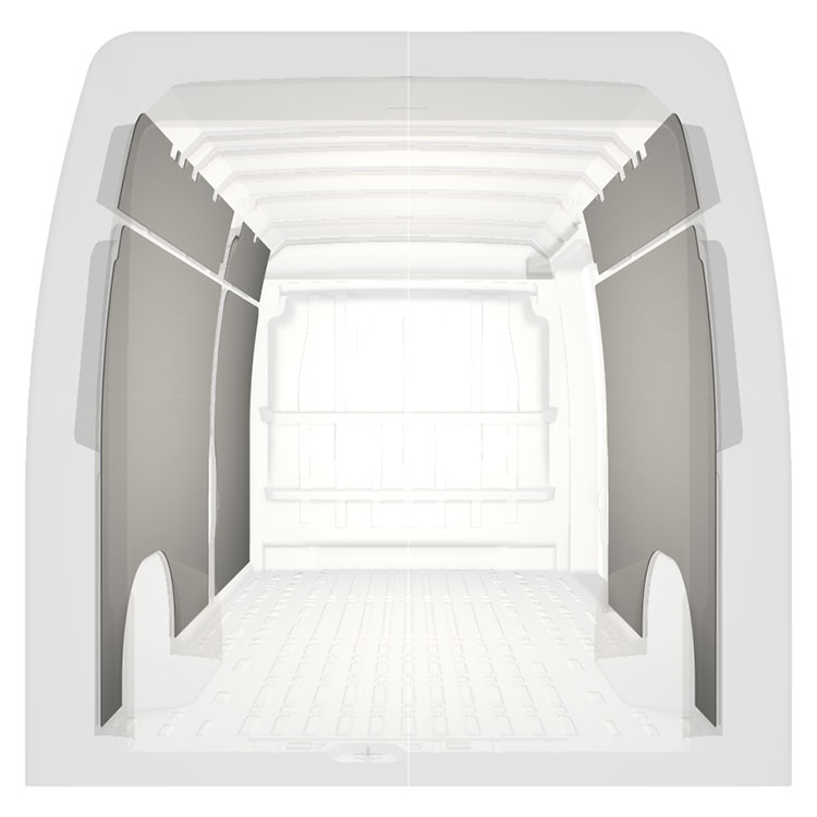 Ligeiro revestimento integral para as paredes interiores do Citroën Jumper / Peugeot Boxer / Fiat Ducato com porta lateral à direita.O revestimento cria um ambiente trabalho luminoso e agradável e é fácil de limpar.