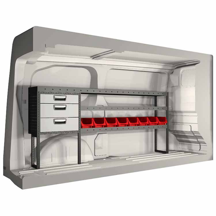 The racking has been specially designed to ensure the optimum fit to the vehicle, as well as the best possible functionality and safety. It has been developed for professional use, is flexible and is intended for service jobs in various types of business. All shelves are equipped with rubber mats, and all drawers with foam plastic liners. Assembly material is included.