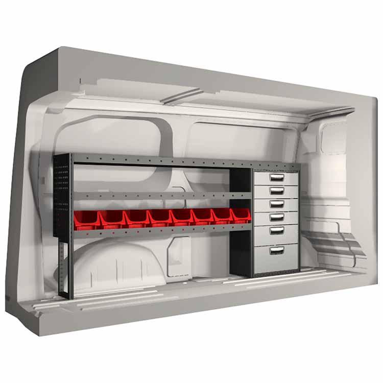The racking has been specially designed to ensure the optimum fit to the vehicle, as well as the best possible functionality and safety. It has been developed for professional use, is flexible and is intended for service jobs in various types of business. All shelves are equipped with rubber mats, and all drawers with foam plastic liners. Assembly material is included.