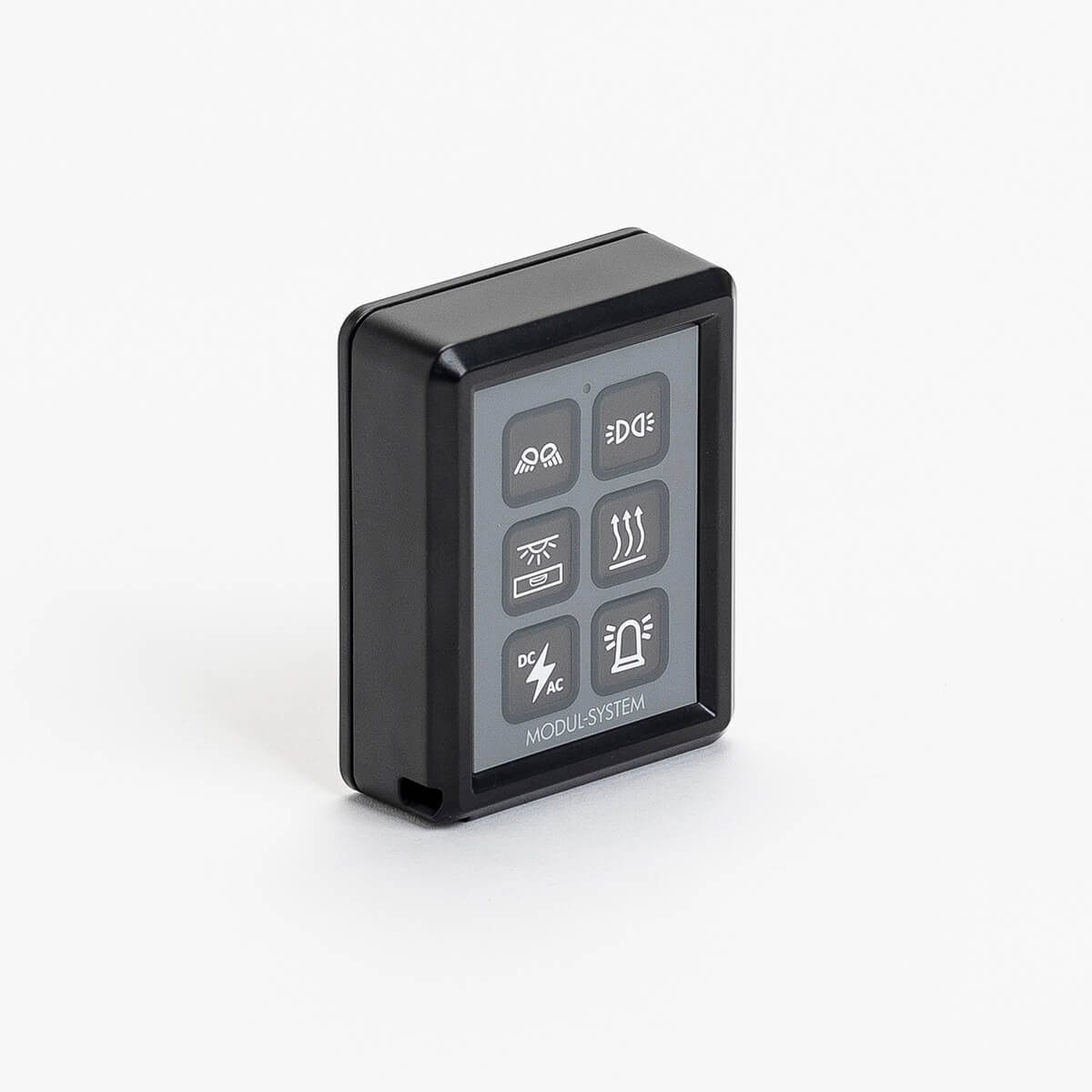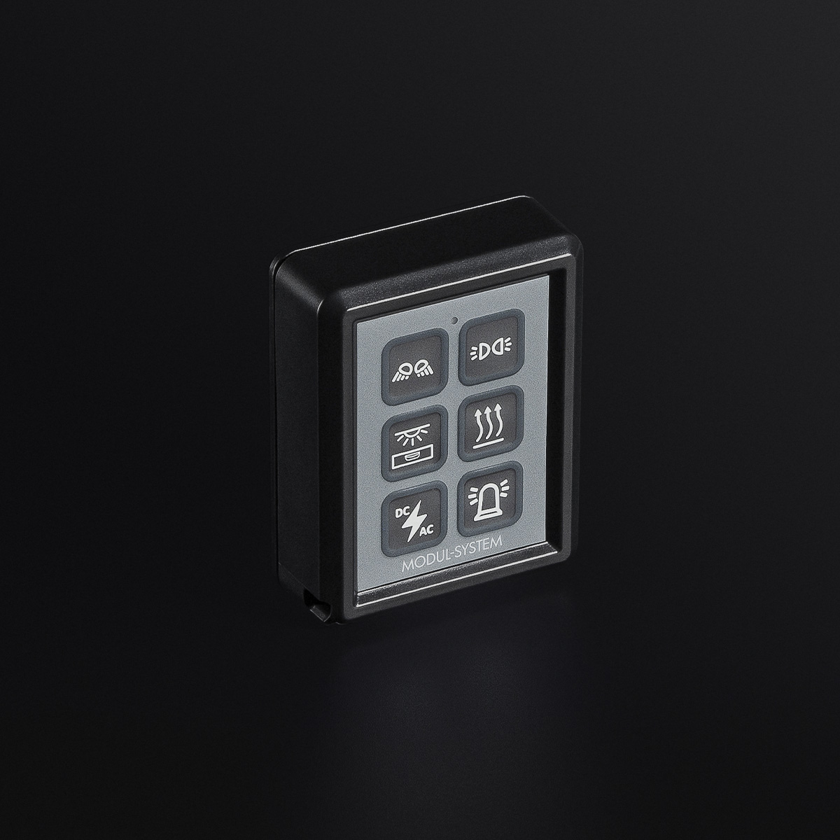 O painel de interruptores funciona com baterias de lítio e é controlado por Bluetooth®. É fácil de instalar utilizando a função de Bluetooth® e de montar no veículo utilizando fitas adesivas almofadadas. O painel de interruptores também se pode utilizar como comando à distãncia, tendo um alcance de funcionamento até 100m.