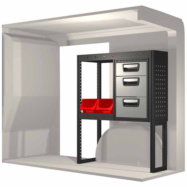 The racking has been specially designed to ensure the optimum fit to the vehicle, as well as the best possible functionality and safety. It has been developed for professional use, is flexible and is intended for service jobs in various types of business. All shelves are equipped with rubber mats, and all drawers with foam plastic liners. Assembly material is included.