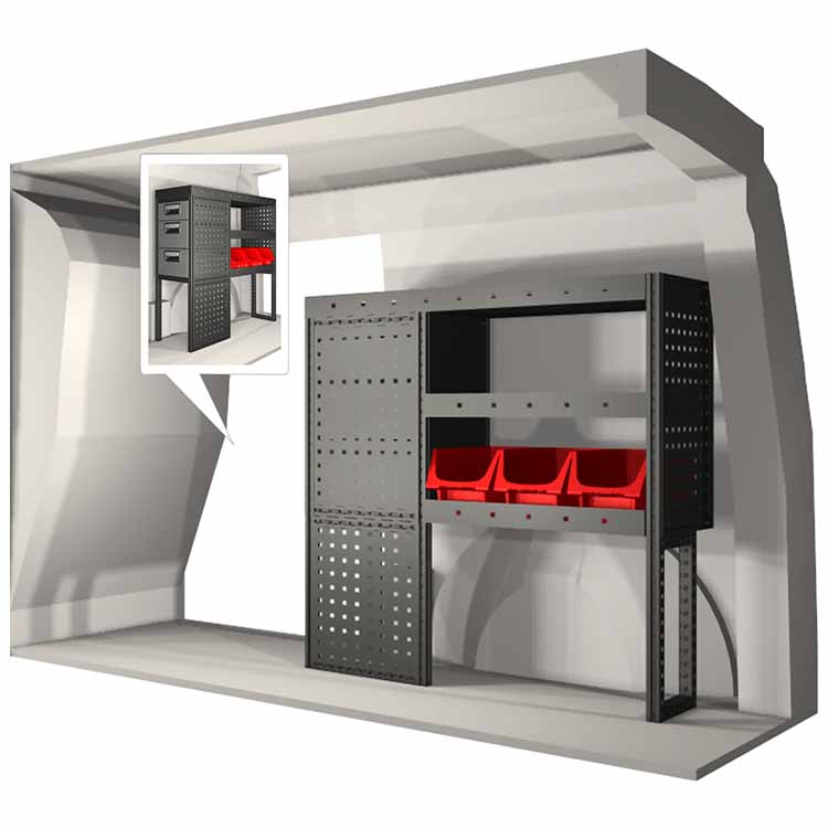 The racking has been specially designed to ensure the optimum fit to the vehicle, as well as the best possible functionality and safety. It has been developed for professional use, is flexible and is intended for service jobs in various types of business. All shelves are equipped with rubber mats, and all drawers with foam plastic liners. Assembly material is included.