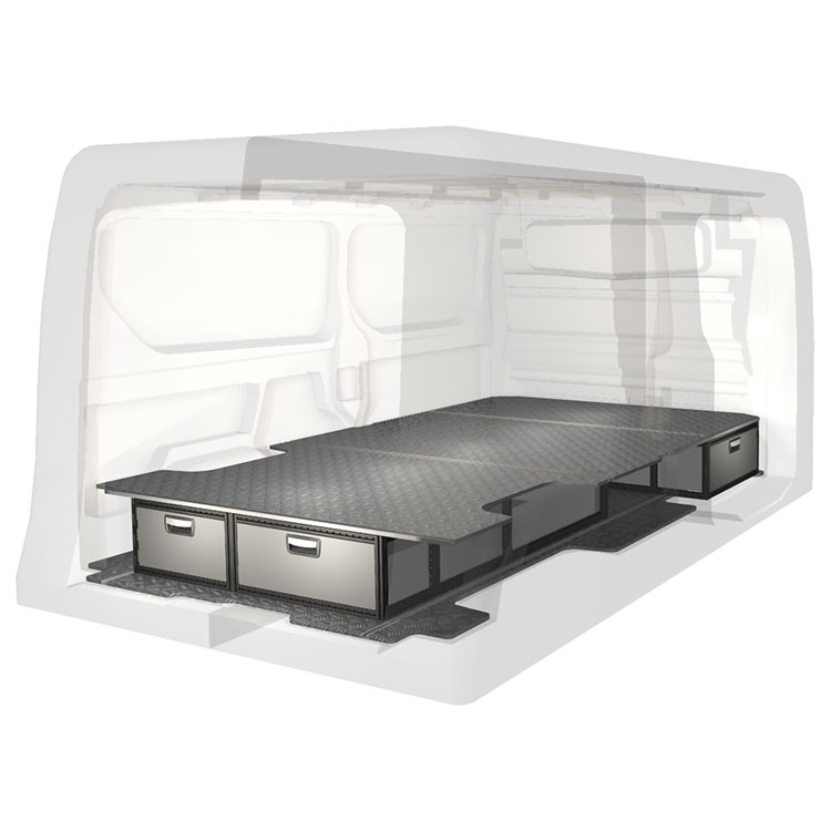 The kit is designed to be fitted on top of a Modul-Floor, utilizing the floor rails for a non-intrusive installation. The double floor is equipped with rails for easy installation of vehicle racking, and edging strips for a nice finish.
