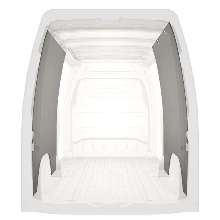 Ligeiro revestimento integral para as paredes interiores do Mercedes Sprinter com portas duplas laterais. O revestimento cria um ambiente trabalho luminoso e agradável e é fácil de limpar.
