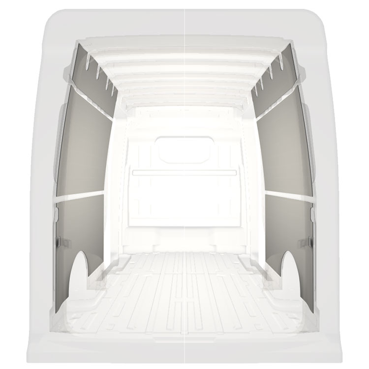 Ligeiro revestimento pré-cortado para as paredes interiores do Volkswagen Crafter / MAN TGE comportas duplas laterais. O revestimento cria um ambiente trabalho luminoso e agradável e é fácil de limpar.