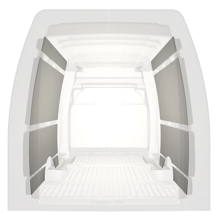Ligeiro revestimento pré-cortado para as paredes interiores do Iveco Daily comportas duplas laterais. O revestimento cria um ambiente trabalho luminoso e agradável e é fácil de limpar.