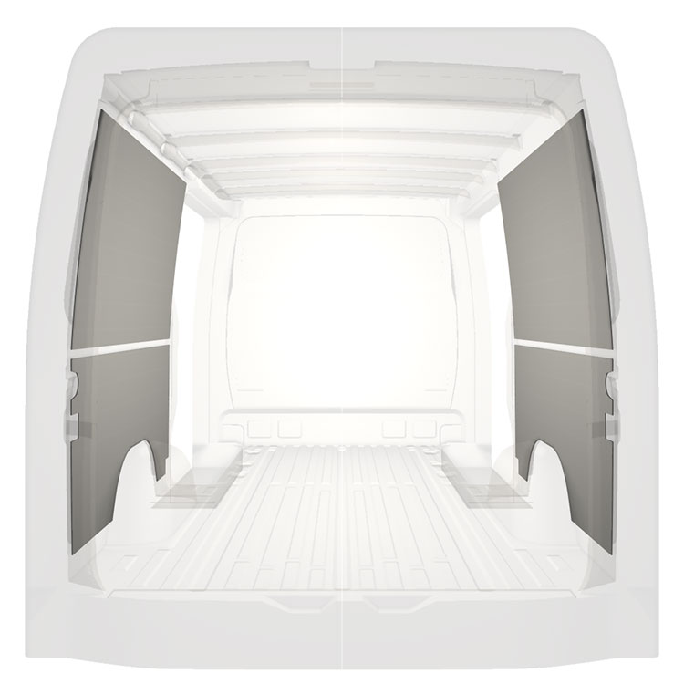 Ligeiro revestimento pré-cortado para as paredes interiores do Mercedes Sprinter comportas duplas laterais. O revestimento cria um ambiente trabalho luminoso e agradável e é fácil de limpar.