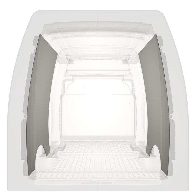 Ligeiro revestimento integral para as paredes interiores do Iveco Daily com portas duplas laterais. O revestimento cria um ambiente trabalho luminoso e agradável e é fácil de limpar.