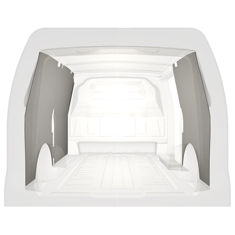 Ligeiro revestimento integral para as paredes interiores do Mercedes Vito com porta lateral à direita.O revestimento cria um ambiente trabalho luminoso e agradável e é fácil de limpar.
