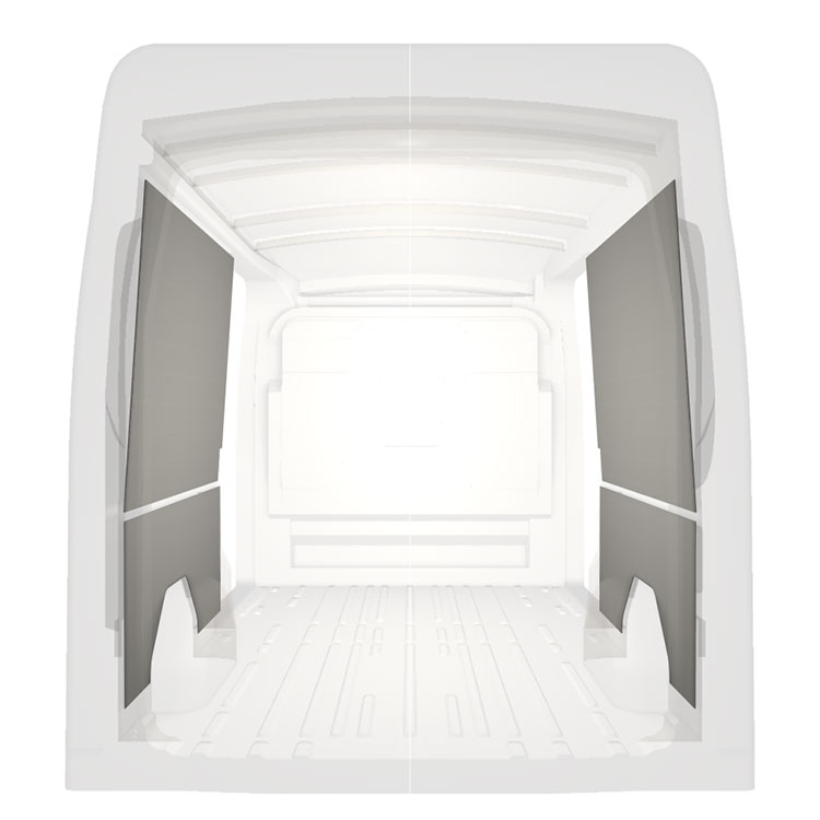 Ligeiro revestimento pré-cortado para as paredes interiores do Ford Transit comportas duplas laterais. O revestimento cria um ambiente trabalho luminoso e agradável e é fácil de limpar.