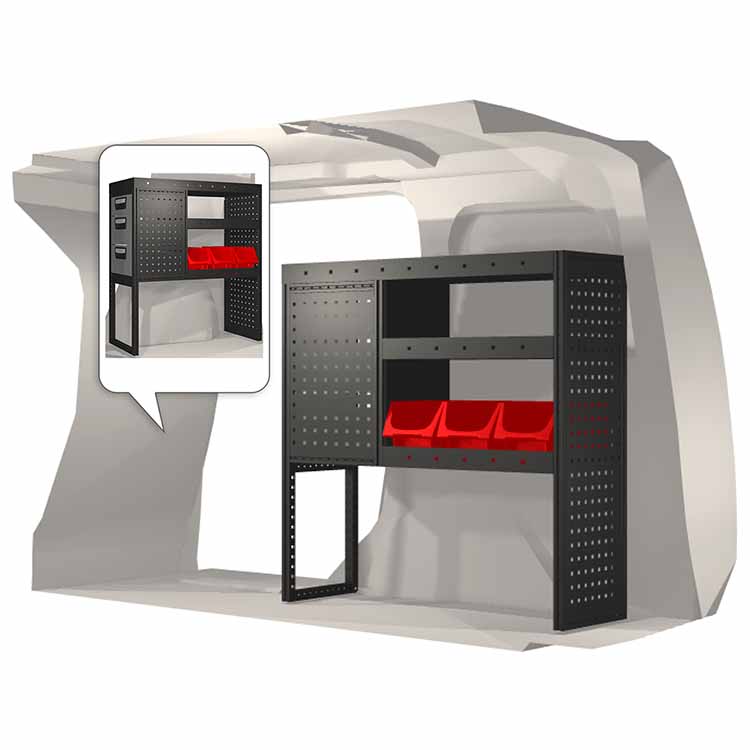 The racking has been specially designed to ensure the optimum fit to the vehicle, as well as the best possible functionality and safety. It has been developed for professional use, is flexible and is intended for service jobs in various types of business. All shelves are equipped with rubber mats, and all drawers with foam plastic liners. Assembly material is included.