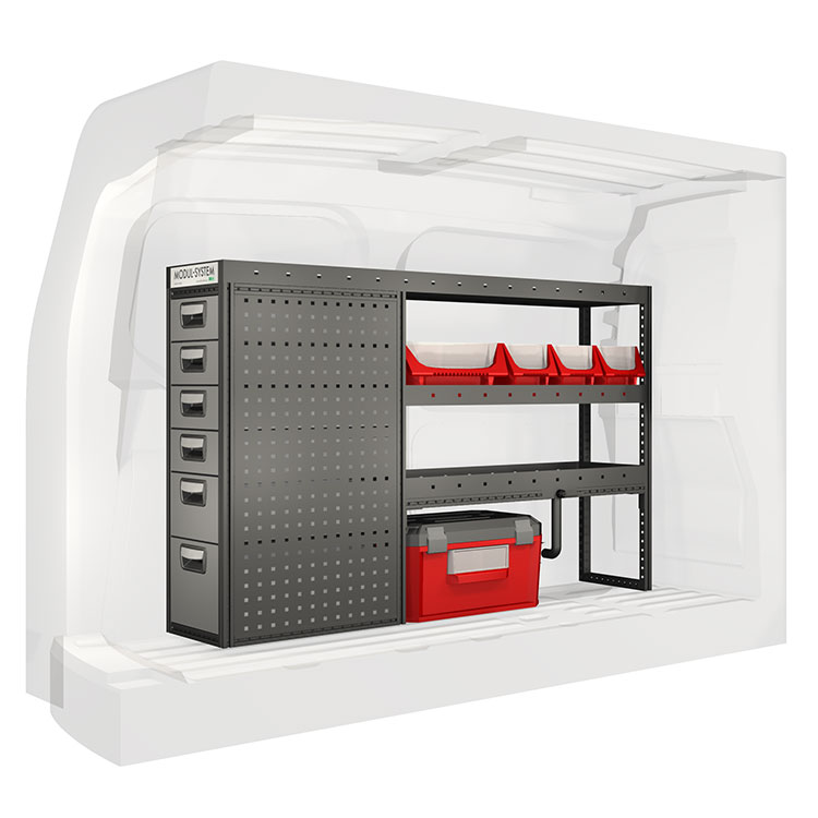 The racking has been specially designed to ensure the optimum fit to the vehicle, as well as the best possible functionality and safety. It has been developed for professional use, is flexible and is intended for service jobs in various types of business. All shelves are equipped with rubber mats, and all drawers with foam plastic liners. Assembly material is included.