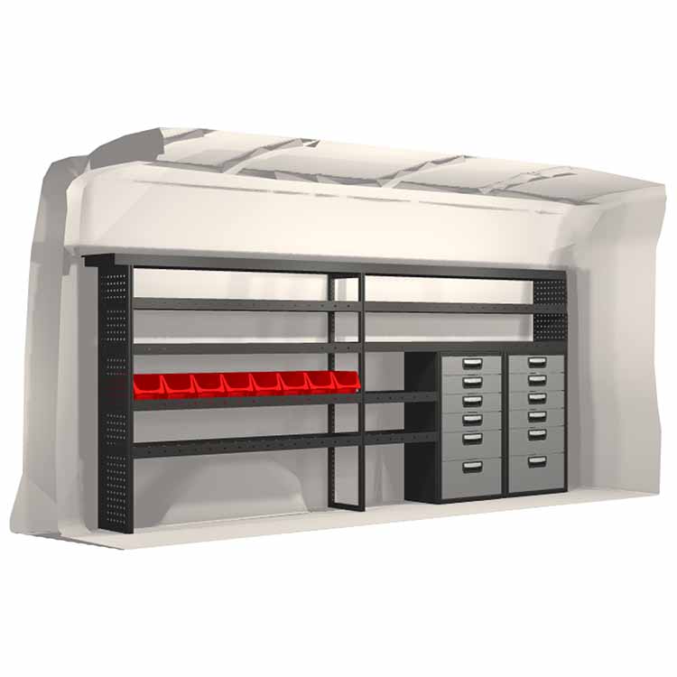 The racking has been specially designed to ensure the optimum fit to the vehicle, as well as the best possible functionality and safety. It has been developed for professional use, is flexible and is intended for service jobs in various types of business. All shelves are equipped with rubber mats, and all drawers with foam plastic liners. Assembly material is included.