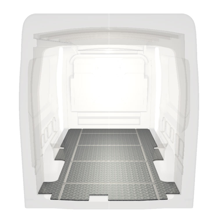 Ligeiro e robusto piso de carrinha com calhas transversais para Ford Transit com chapa de alumÃnio antiderrapante e calhas de carga (longitudinal e transversal) para instalação rápida e segura dos sistema de transporte e outros acessórios.