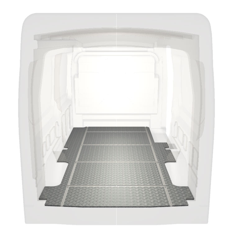 Ligeiro e robusto piso de carrinha com calhas transversais para Ford Transit com chapa de alumÃnio antiderrapante e calhas de carga (longitudinal e transversal) para instalação rápida e segura dos sistema de transporte e outros acessórios.