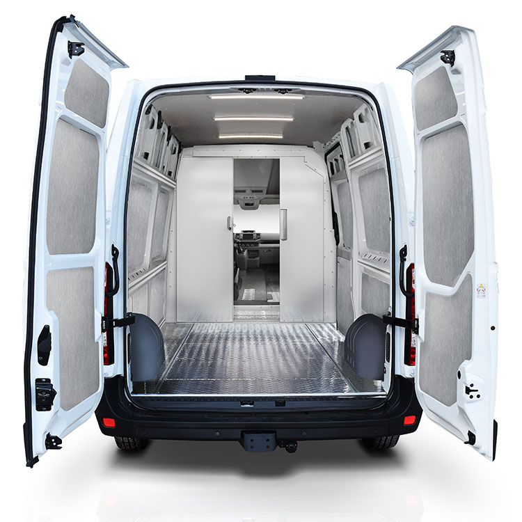 | The bulkhead, made from lightweight material, is equipped with a sliding door for quick and easy access to the cargo area from the cabin. The door is centered to create maximal space between the driver and passenger seat, making loading and unloading easier and more efficient. This bulkhead comes with an extra high door which requires a high cabin roof or modification of low cabin roof. The bulkhead is pre-assembled in the Modul-System factory, which allows for quick and easy installation in the vehicle. Door height: 1810 mm Installation time: 1 hour |
