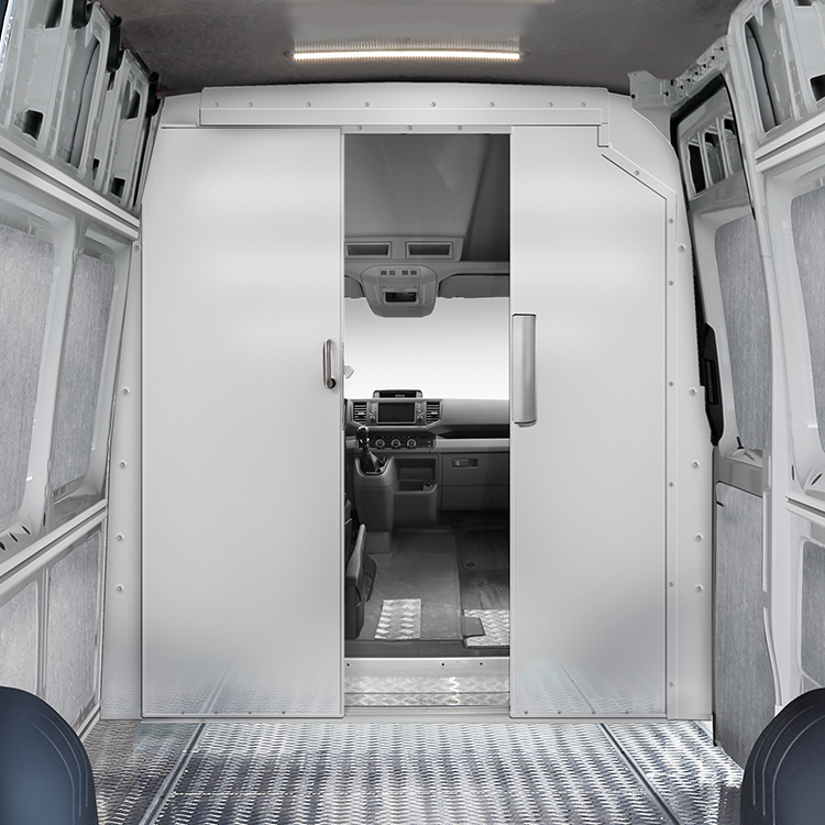 The bulkhead, made from lightweight material, is equipped with a sliding door for quick and easy access to the cargo area from the cabin. The door is centered to create maximal space between the driver and passenger seat, making loading and unloading easier and more efficient.