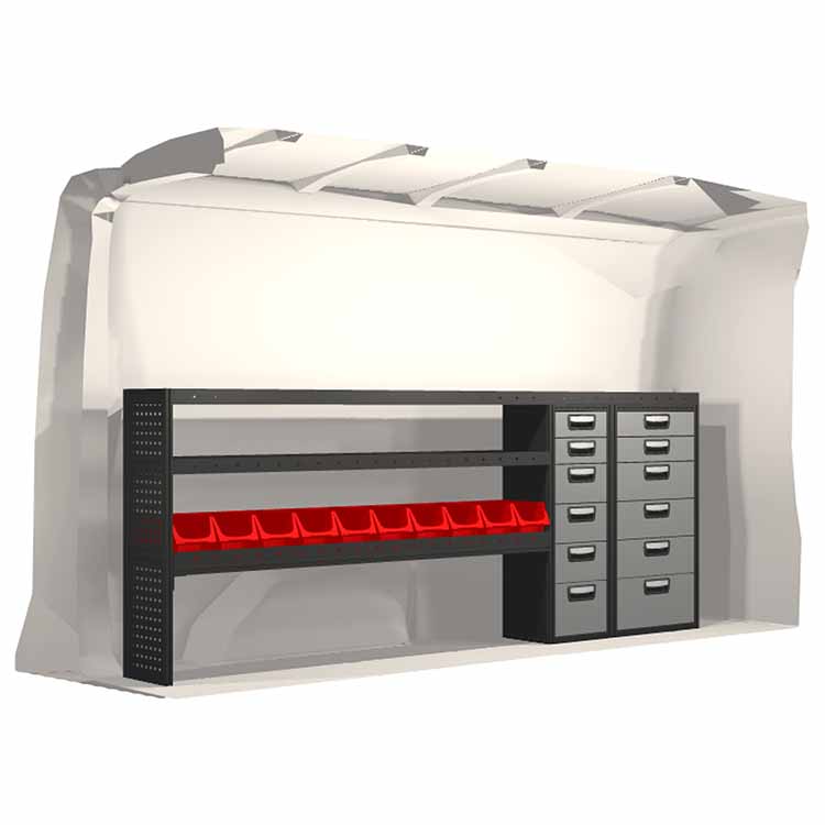 The racking has been specially designed to ensure the optimum fit to the vehicle, as well as the best possible functionality and safety. It has been developed for professional use, is flexible and is intended for service jobs in various types of business. All shelves are equipped with rubber mats, and all drawers with foam plastic liners. Assembly material is included.