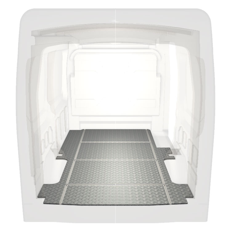 Ligeiro e robusto piso de carrinha com calhas transversais para Ford Transit com chapa de alumÃnio antiderrapante e calhas de carga (longitudinal e transversal) para instalação rápida e segura dos sistema de transporte e outros acessórios.