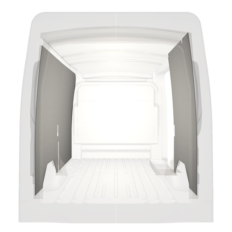 Ligeiro revestimento integral para as paredes interiores do Ford Transit com porta lateral à direita.O revestimento cria um ambiente trabalho luminoso e agradável e é fácil de limpar.