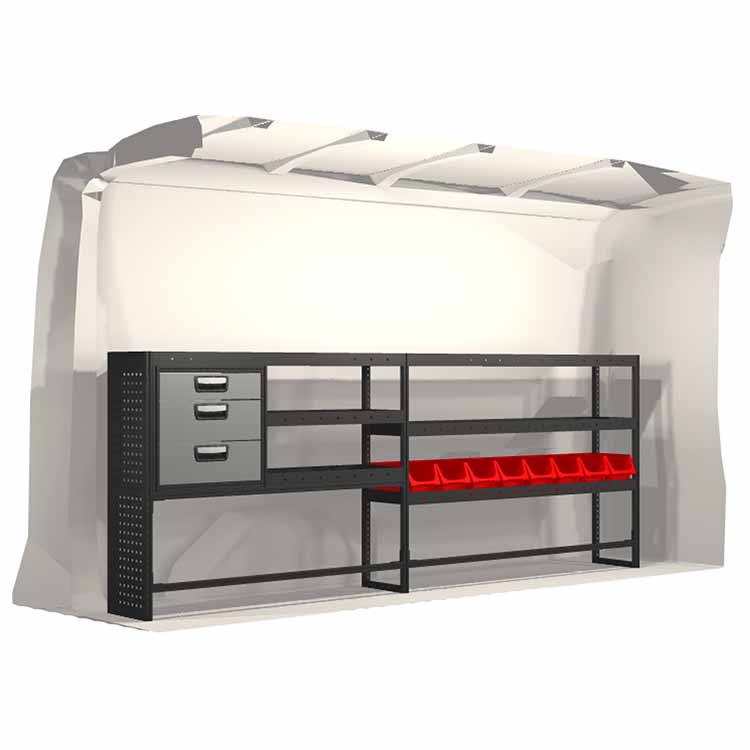 The racking has been specially designed to ensure the optimum fit to the vehicle, as well as the best possible functionality and safety. It has been developed for professional use, is flexible and is intended for service jobs in various types of business. All shelves are equipped with rubber mats, and all drawers with foam plastic liners. Assembly material is included.