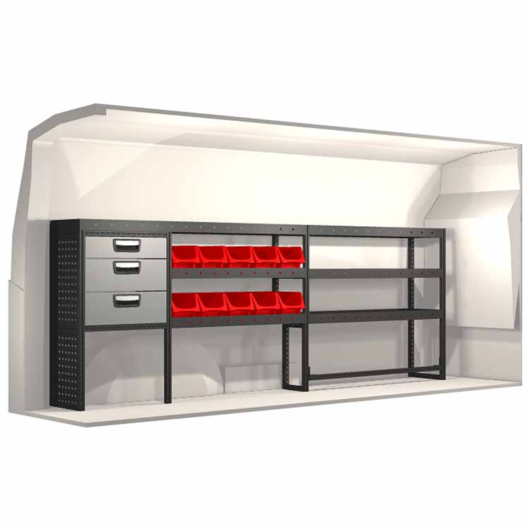 The racking has been specially designed to ensure the optimum fit to the vehicle, as well as the best possible functionality and safety. It has been developed for professional use, is flexible and is intended for service jobs in various types of business. All shelves are equipped with rubber mats, and all drawers with foam plastic liners. Assembly material is included.
