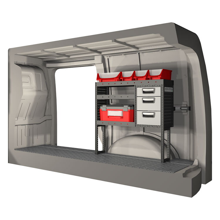 The racking has been specially designed to ensure the optimum fit to the vehicle, as well as the best possible functionality and safety. It has been developed for professional use, is flexible and is intended for service jobs in various types of business. All shelves are equipped with rubber mats, and all drawers with foam plastic liners. Assembly material is included.