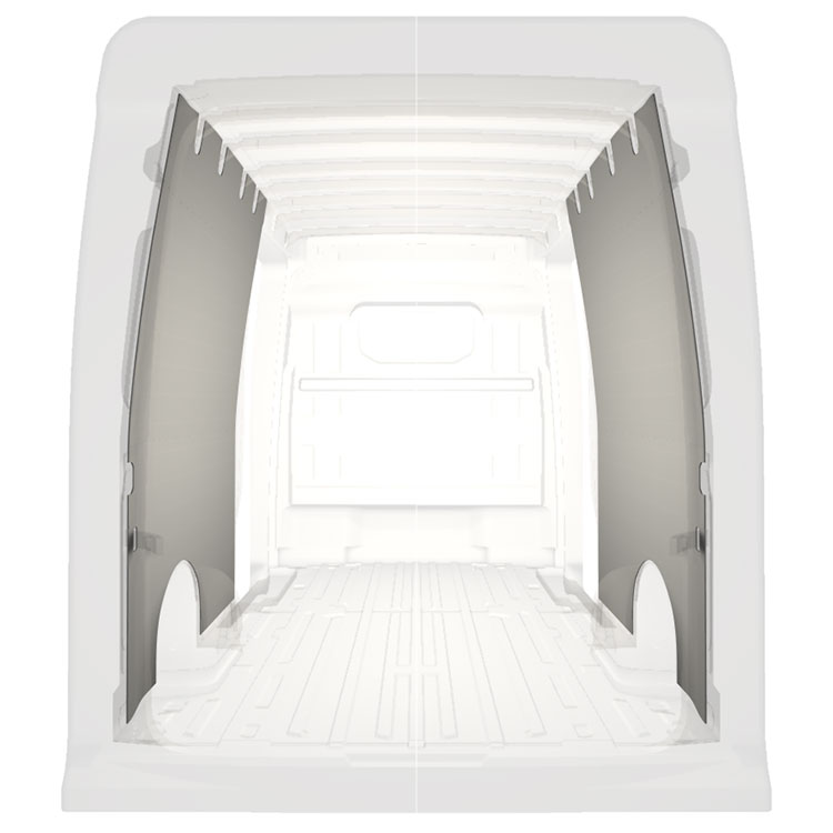 Ligeiro revestimento integral para as paredes interiores do Volkswagen Crafter / MAN TGE com portas duplas laterais. O revestimento cria um ambiente trabalho luminoso e agradável e é fácil de limpar.