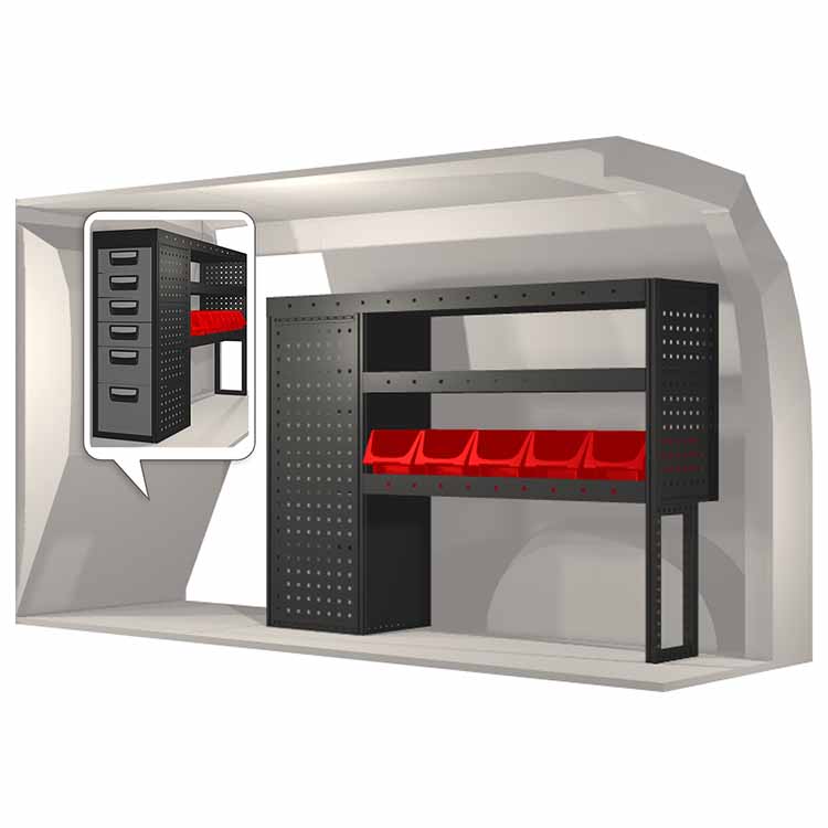 The racking has been specially designed to ensure the optimum fit to the vehicle, as well as the best possible functionality and safety. It has been developed for professional use, is flexible and is intended for service jobs in various types of business. All shelves are equipped with rubber mats, and all drawers with foam plastic liners. Assembly material is included.