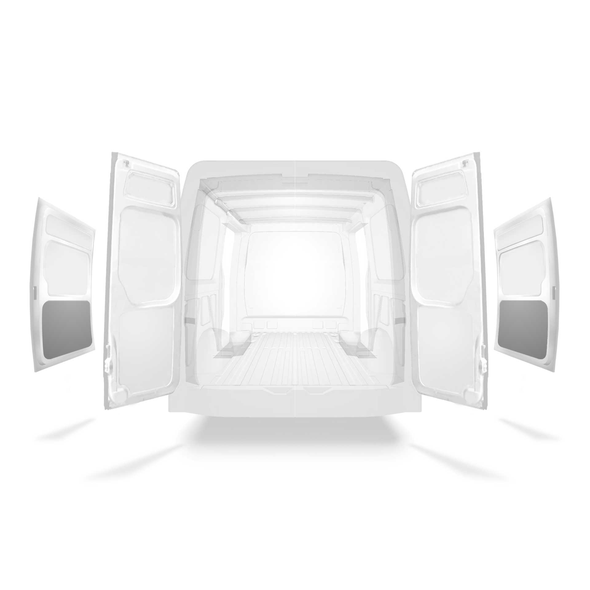 Revestimento leve para a parte inferior da porta lateral de um Mercedes Sprinter com duplas portas laterais. O revestimento irá reduzir o desgaste do interior e ajudar a manter o valor residual do veículo.
