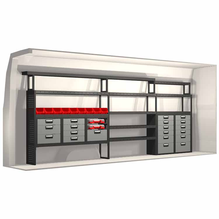 The racking has been specially designed to ensure the optimum fit to the vehicle, as well as the best possible functionality and safety. It has been developed for professional use, is flexible and is intended for service jobs in various types of business. All shelves are equipped with rubber mats, and all drawers with foam plastic liners. Assembly material is included.