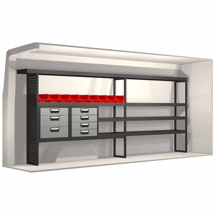 The racking has been specially designed to ensure the optimum fit to the vehicle, as well as the best possible functionality and safety. It has been developed for professional use, is flexible and is intended for service jobs in various types of business. All shelves are equipped with rubber mats, and all drawers with foam plastic liners. Assembly material is included.