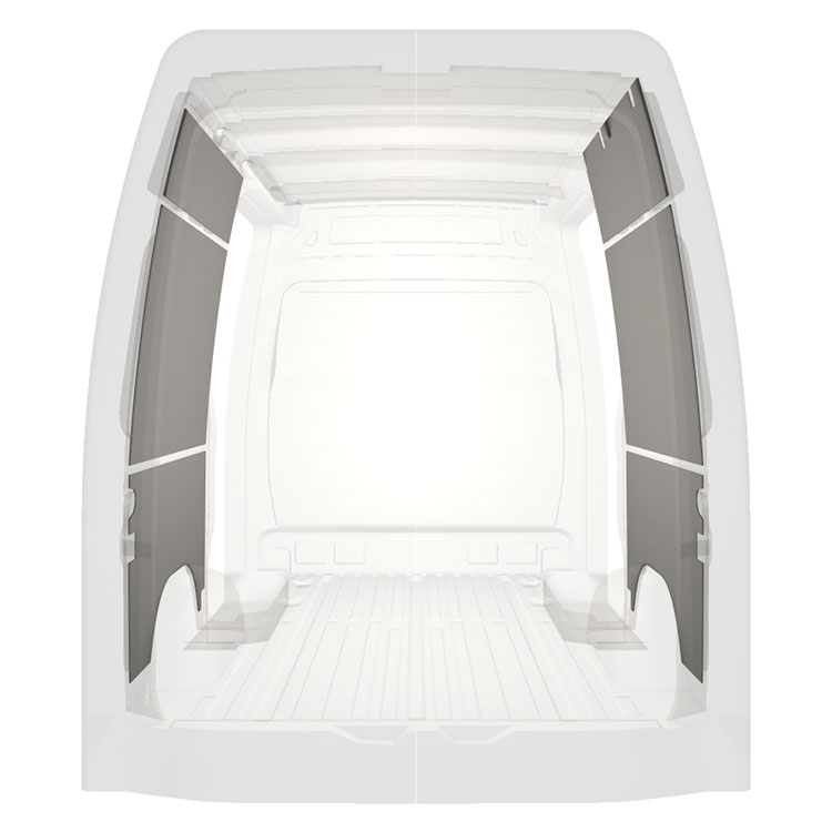 Ligeiro revestimento pré-cortado para as paredes interiores do Mercedes Sprinter comportas duplas laterais. O revestimento cria um ambiente trabalho luminoso e agradável e é fácil de limpar.