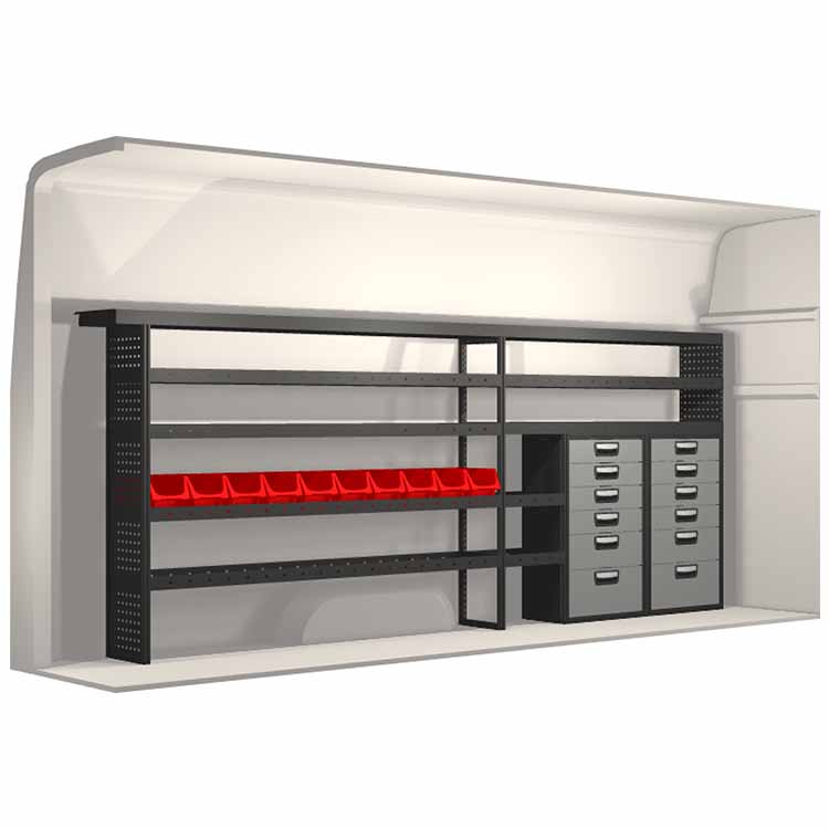 The racking has been specially designed to ensure the optimum fit to the vehicle, as well as the best possible functionality and safety. It has been developed for professional use, is flexible and is intended for service jobs in various types of business. All shelves are equipped with rubber mats, and all drawers with foam plastic liners. Assembly material is included.