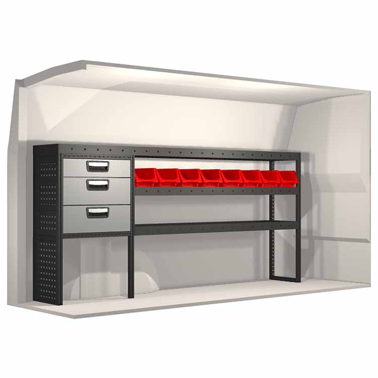 The racking has been specially designed to ensure the optimum fit to the vehicle, as well as the best possible functionality and safety. It has been developed for professional use, is flexible and is intended for service jobs in various types of business. All shelves are equipped with rubber mats, and all drawers with foam plastic liners. Assembly material is included.