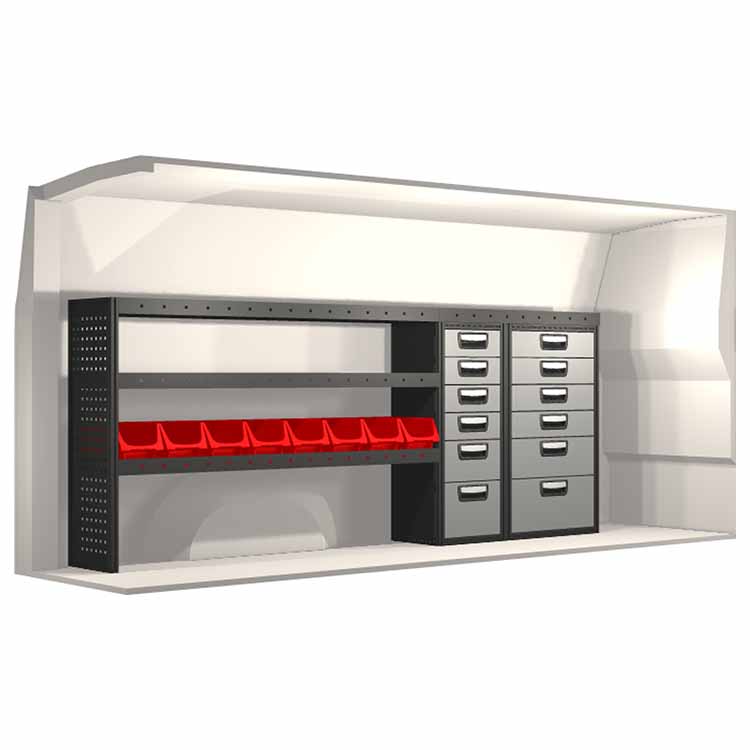 The racking has been specially designed to ensure the optimum fit to the vehicle, as well as the best possible functionality and safety. It has been developed for professional use, is flexible and is intended for service jobs in various types of business. All shelves are equipped with rubber mats, and all drawers with foam plastic liners. Assembly material is included.