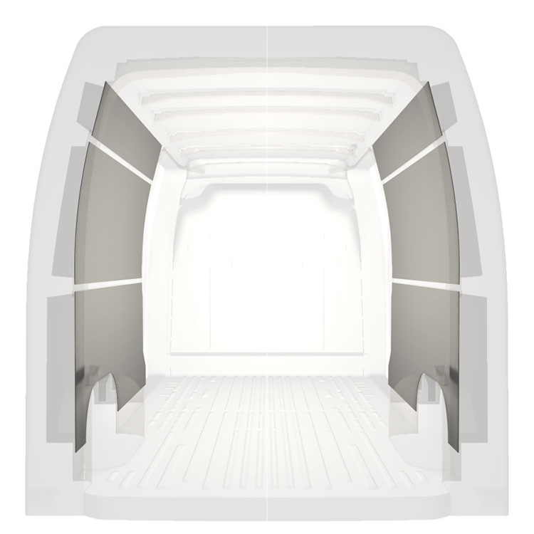 Ligeiro revestimento pré-cortado para as paredes interiores do Renault Master / Opel Movano / Nissan NV400 comportas duplas laterais. O revestimento cria um ambiente trabalho luminoso e agradável e é fácil de limpar.