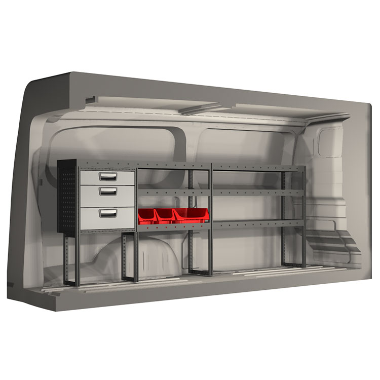 The racking has been specially designed to ensure the optimum fit to the vehicle, as well as the best possible functionality and safety. It has been developed for professional use, is flexible and is intended for service jobs in various types of business. All shelves are equipped with rubber mats, and all drawers with foam plastic liners. Assembly material is included.