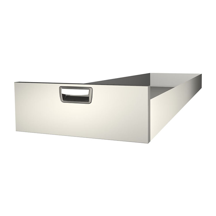 Gaveta extra-longa robusta para montagem numa armação de gaveta. A gaveta, feita de alumínio, tem rolamentos de esferas como padrão e a mistura de rolamentos fixos e flexíveis torna a gaveta estável e fácil de operar.