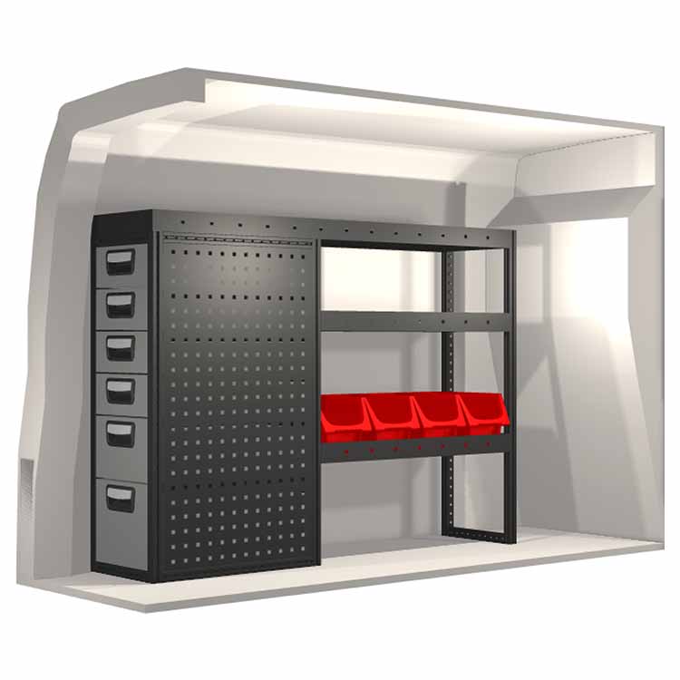 The racking has been specially designed to ensure the optimum fit to the vehicle, as well as the best possible functionality and safety. It has been developed for professional use, is flexible and is intended for service jobs in various types of business. All shelves are equipped with rubber mats, and all drawers with foam plastic liners. Assembly material is included.