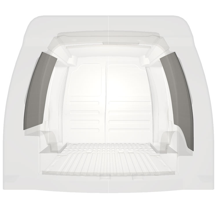 Ligeiro revestimento integral para as paredes interiores do Volkswagen Caddy com portas duplas laterais. O revestimento cria um ambiente trabalho luminoso e agradável e é fácil de limpar.