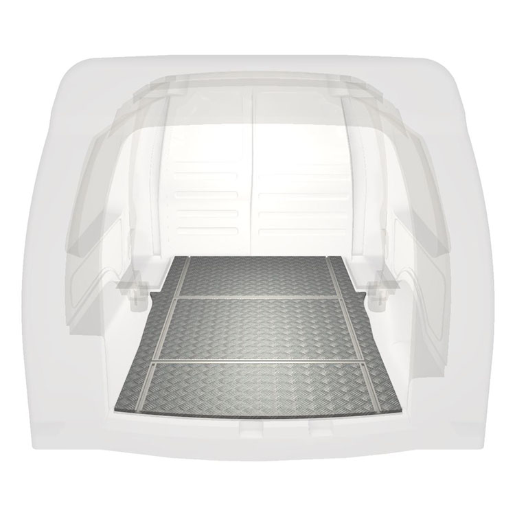 Ligeiro e robusto piso de carrinha com calhas transversais para Volkswagen Caddy Maxi com chapa de alumÃnio antiderrapante e calhas de carga (longitudinal e transversal) para instalação rápida e segura dos sistema de transporte e outros acessórios.