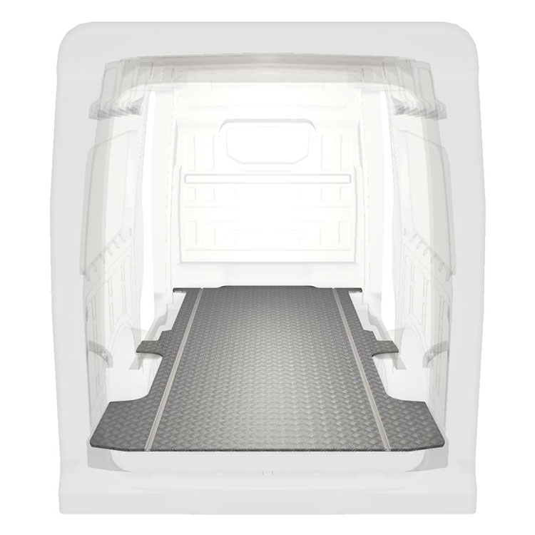 Ligeiro e robusto piso de carrinha extra longo para Volkswagen Crafter / MAN TGE com chapa de alumÃnio antiderrapante e calhas de carga (longitudinal) para instalação rápida e segura dos sistema de transporte e outros acessórios.