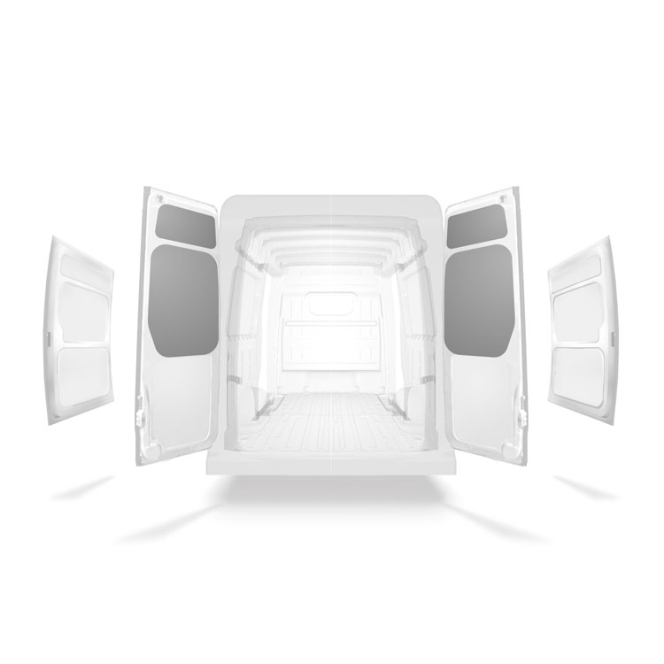 Ligeiro painel de revestimento superior para porta traseira do Volkswagen Crafter / MAN TGE com portas duplas. Concebidos para criar um acabamento profissional no interior, os revestimentos para portas protegem a carrinha e são fáceis de limpar.