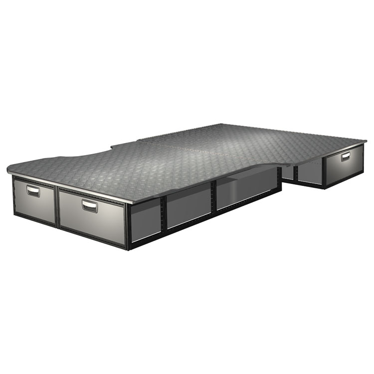 The kit is designed to be fitted on top of a Modul-Floor, utilizing the floor rails for a non-intrusive installation. The double floor is equipped with rails for easy installation of vehicle racking, and edging strips for a nice finish.