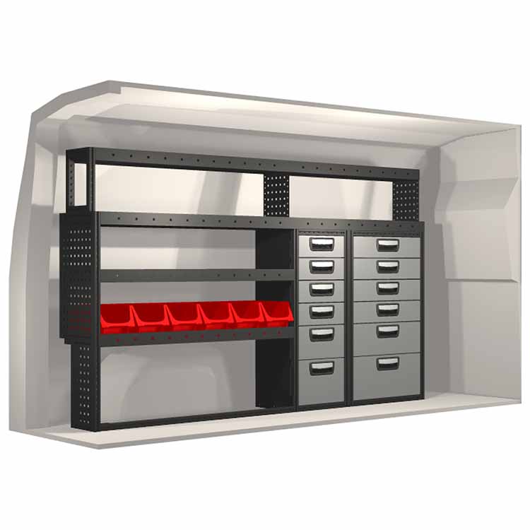 The racking has been specially designed to ensure the optimum fit to the vehicle, as well as the best possible functionality and safety. It has been developed for professional use, is flexible and is intended for service jobs in various types of business. All shelves are equipped with rubber mats, and all drawers with foam plastic liners. Assembly material is included.